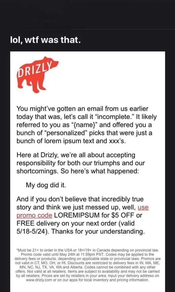 This week, I saw an email from Drizly, an alcohol delivery service. The initial email was, in their own words, "incomplete," filled with "(name)" placeholders and lorem ipsum text. Their follow-up email, however, was a masterclass in how to build trust when you mess up. They owned the mistake with humor ("My dog did it."), offered a relevant restitution ($5 off or free delivery), and expressed gratitude for understanding.